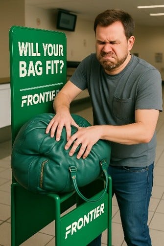 Frontier Airlines. My wife packs for vacations as if we’re never coming back. It’s like she’s loading a 150lb steamer trunk for a voyage on the Titanic. As such, the thought of squeezing everything she wants to bring for a simple weekend trip into a roller bag that must squeeze into Frontier Airline’s “no way your luggage will fit in this” box literally makes me break out in hives. We argued about it a bit. Then arrived at a fair solution. She’s just going to use half of the space in my bag as well. Crisis averted!